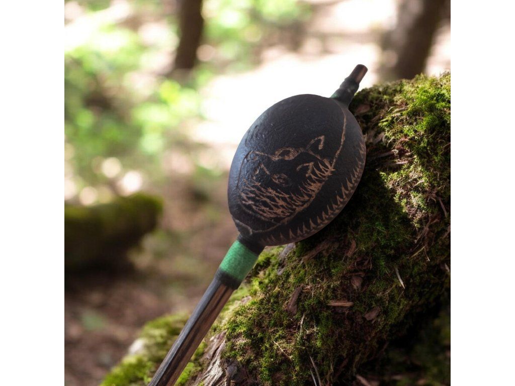 Hrkátko je upevnené na drevenej paličke a jeho vrchná časť je ručne vyrezávaná, čo z neho robí autentický remeselný kúsok s jedinečným charakterom.